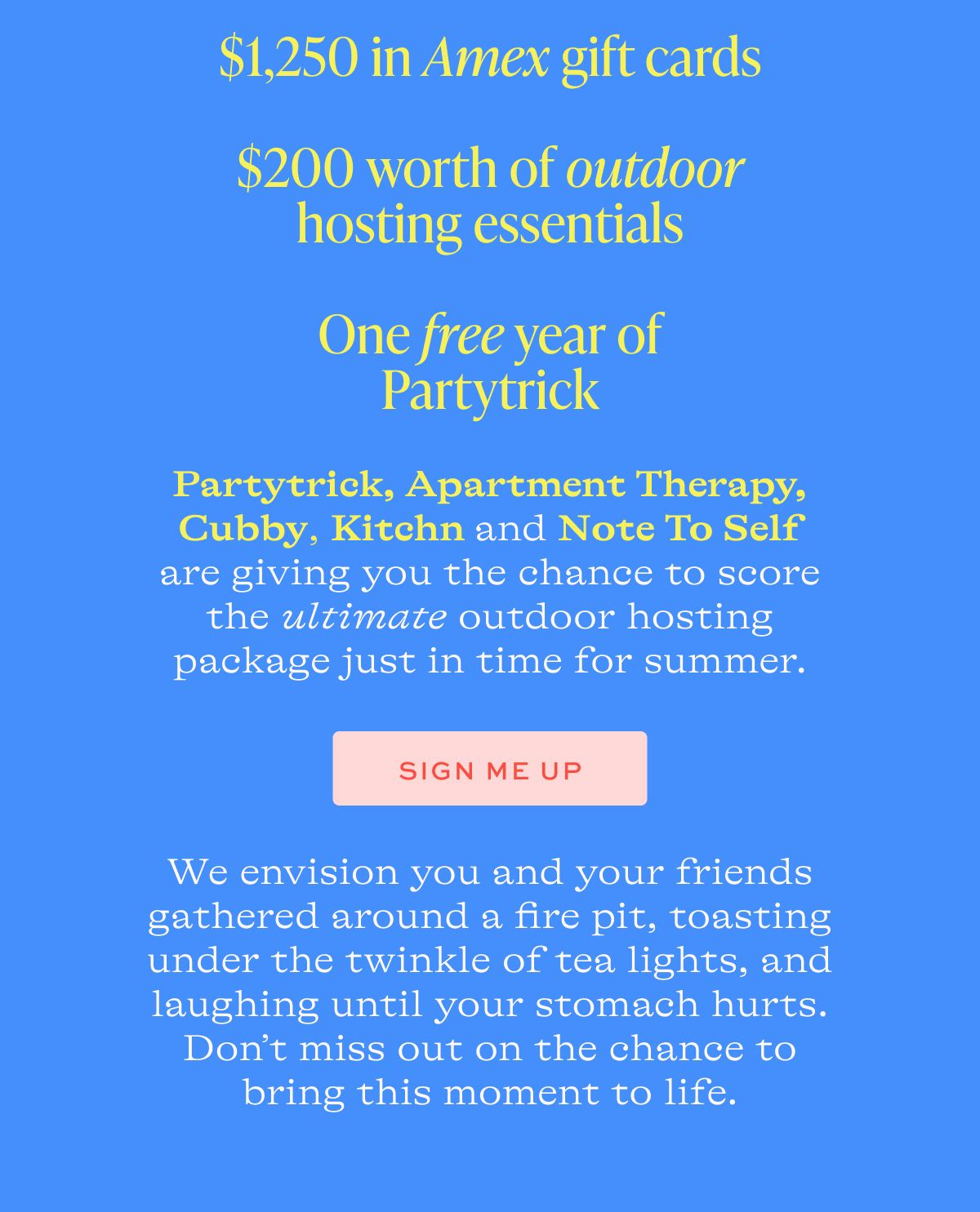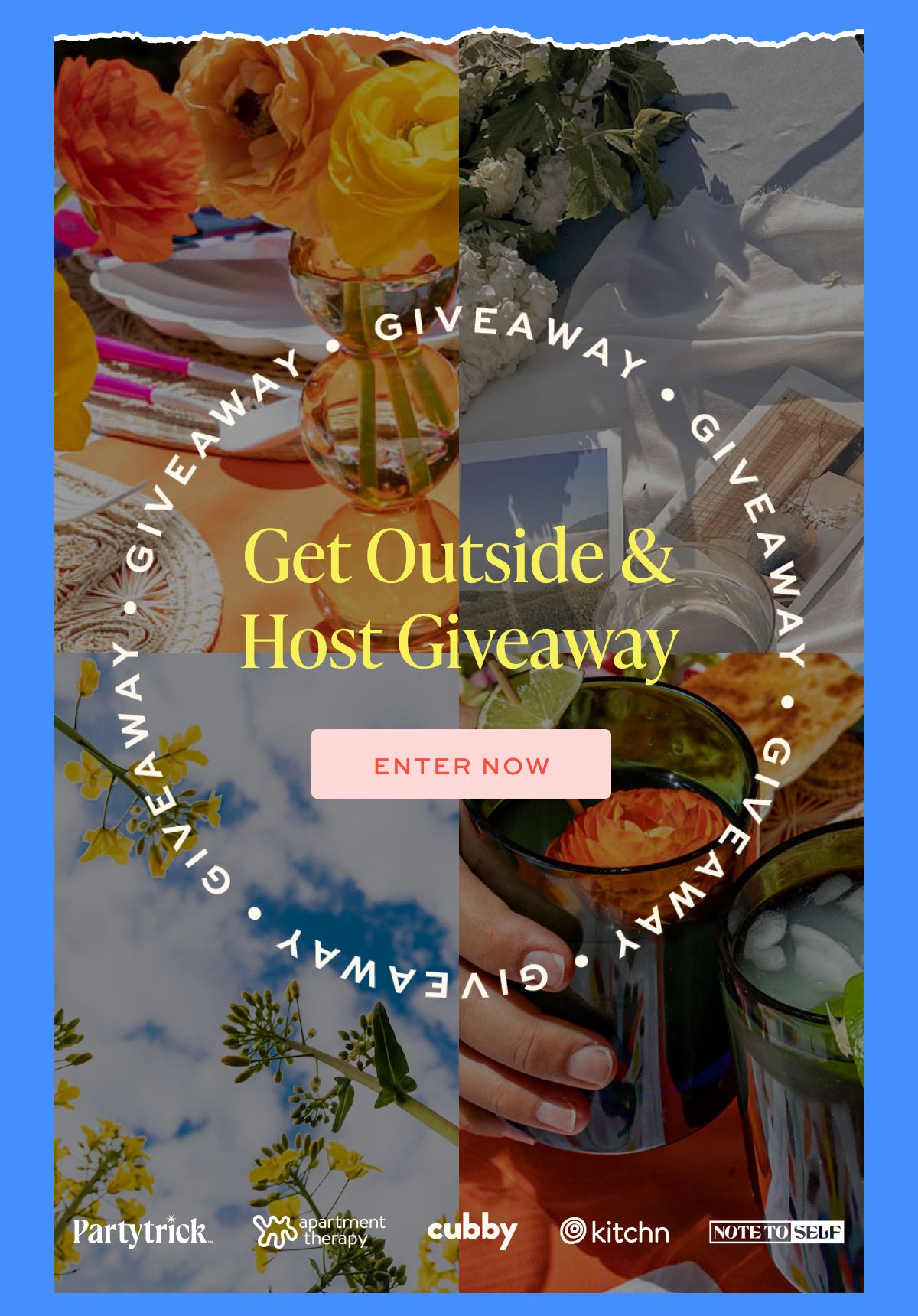 Hi friends!As you know, I'm deep in Partytrick mode, but wanted to share this special giveaway - this opportunity is way too good to pass up. I promise not to spam you too much on this, but Partytrick teamed up with Apartment Therapy to give you everything you need (aka $1,250 in gift cards + $200 in hosting essentials!) to get your outdoor space ready for summer and all the celebrations that come with it. It would mean the world if you entered! And, of course, feel free to share with others.xoxo,Virginia