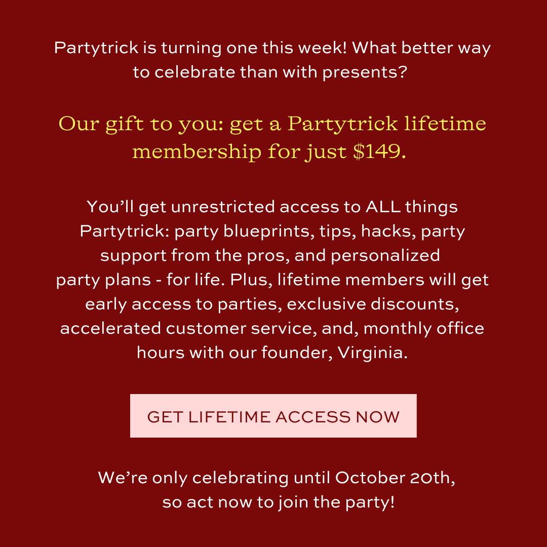 I'm not sure where the time went, but Partytrick is turning 1 this week! In celebration of our birthday, we’re offering our lifetime membership for just $149! That means unlimited access to all the party blueprints, discounts, tips, and personalized event support you need to host great parties forever.Lifetime members unlock exclusive perks including early access to Partytrick content, a dedicated resource for accelerated customer service, office hours with me, Partytrick swag, and so much more.Plus, be one of the first 100 people who get a lifetime membership, and we’ll give you a year of Partytrick to gift to a friend! I hope you'll join us for a LIFETIME of gathering, celebrating, and making memories together. There is SO much to celebrate together.xoxo,Virginia